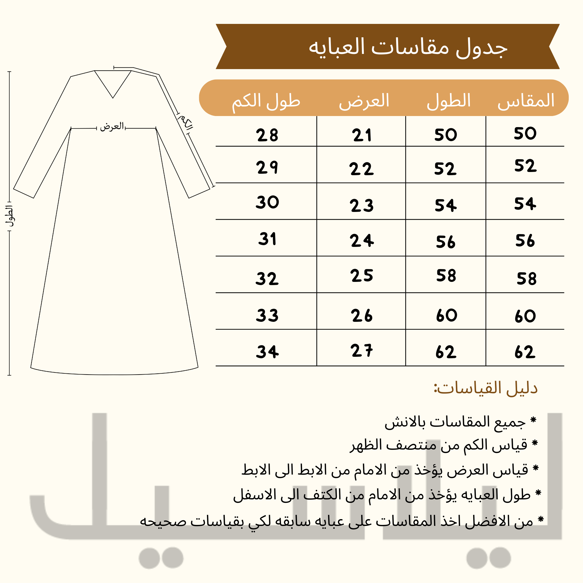 - في حالة عدم وجود مقاسك ضمن جدول المقاسات قومي بكتابة مقاسك في الملاحظات وسنحرص على التواصل بك للتأكيد